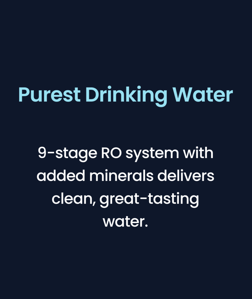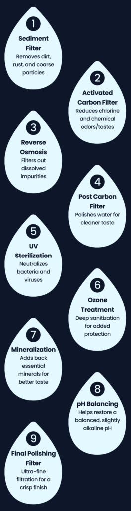 Our advanced 9-stage filtration system delivers clean, safe, great-tasting water. It removes sediment, chemicals, and odors, then uses reverse osmosis, UV disinfection, and ozone sterilization to eliminate chlorine, lead, heavy metals, VOCs, bacteria, and viruses. It also improves taste and balances pH, so you get ultra-pure water you can trust every time.